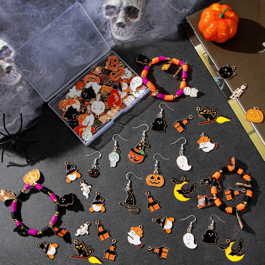 HTZNHXT 50 Pcs Halloween Charms, Halloween Alloy Charm Enamel, Pumpkin, Witch Hat, Ghost, Spider, Bat Pendants, Assorted Pendant Charms for Bracelet, Earring, Jewelry Making