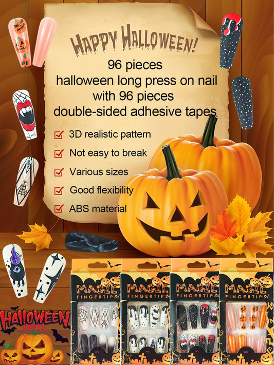 96 Pcs Halloween Press on Nails, Wsimily Halloween Long Coffin Acrylic Artificial False Nails Fake Nail with 96 Pcs Nail Adhesive Tabs, Pumpkin Spider Bat Design for Women Girl Nail Art Decoration