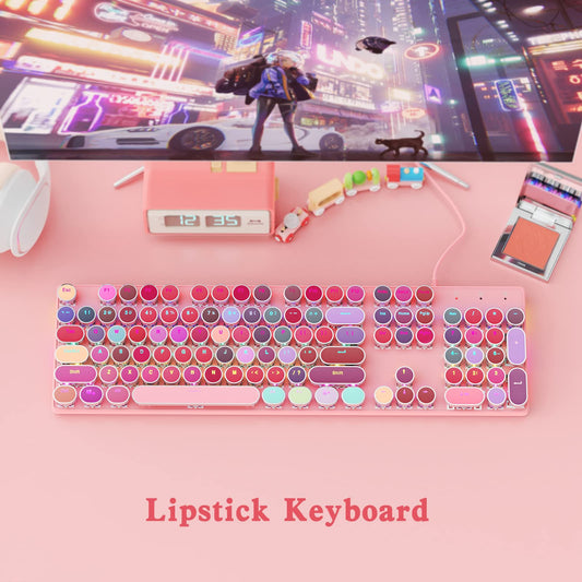 HUO JI Typewriter Mechanical Gaming Keyboard with RGB Sidelit and Rainbow Backlit, Retro Style, Red Switches, Metal Panel, Lipstick 104 Keys for Mac, PC, Cute Pink