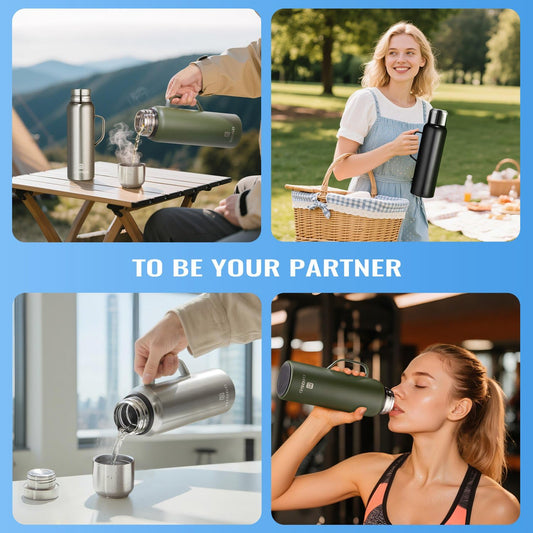 Insulated Vacuum Thermo Bottle 750ml/25.4oz with Cup Stainless Steel Coffee Bottles for Hot and Cold Drink Water Flask.(Green, with Handle, 750ml)