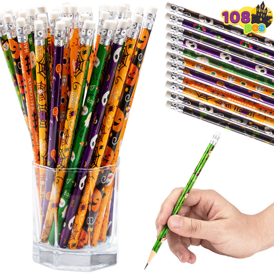 JOYIN 108 PCS Halloween Pencil Assortment with Eraser in 12 Designs, Assorted Colorful Wood Pencils Themed Stationery Set for Kids Trick or Treat, Classroom Party Favor Supply Prize, Goodie Bag Filler