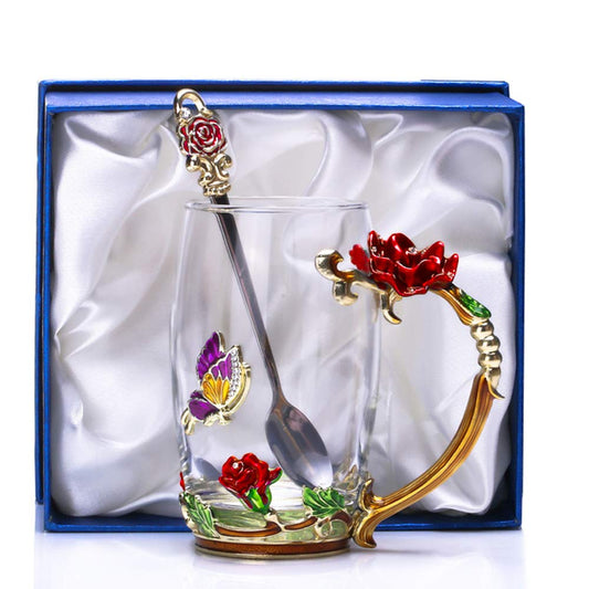 Kaiyuan Dynasty Tea Cup Glass Coffee Mugs Enamel Rose Flower Butterfly Drinking Cups with Spoon Set for Birthday Wedding Red Rose Tall Mug 12oz