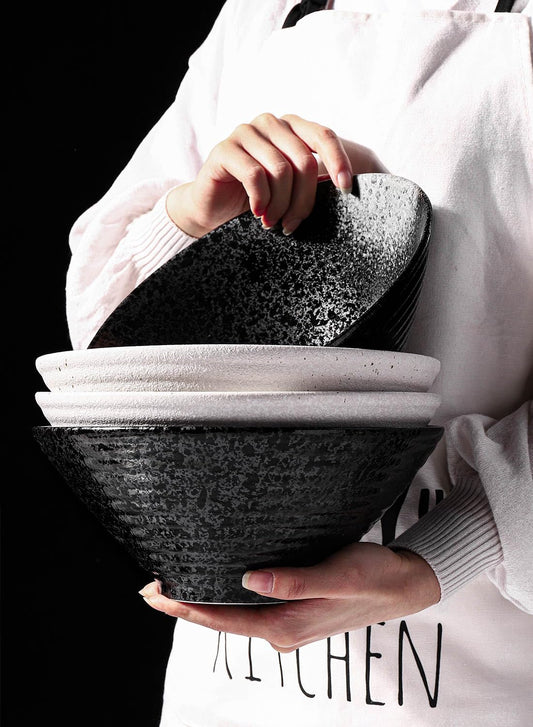Kanwone Ceramic Japanese Ramen Bowl Set, Noodle Soup Bowls - 60 Ounce, with Matching Spoons and Chopsticks for Udon Soba Pho Asian Noodles, Set of 2, Black