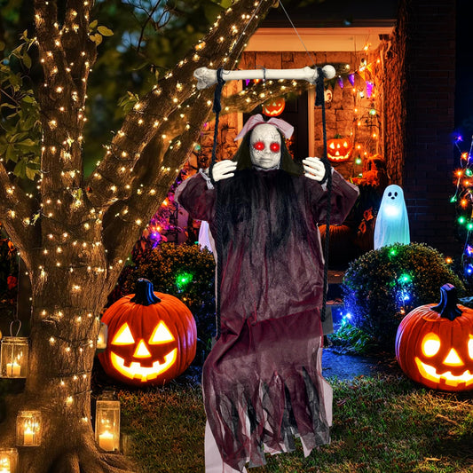 KEUCL Halloween Decorations, Hanging Swing Ghost with Voice Activated, Creepy Sound/Light Up Eyes, Halloween Animatronics Spooky Haunted House Holiday Prop for Outdoor Indoor Yard Garden Patio Trees