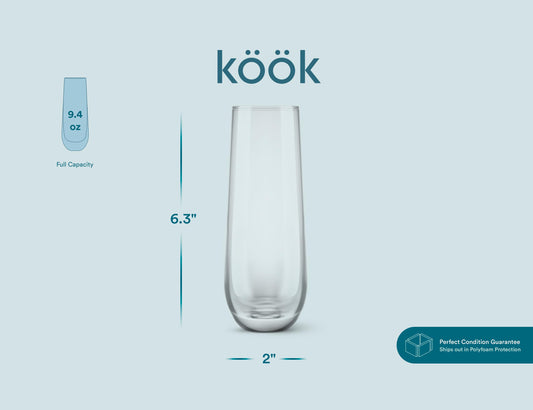 KooK Stemless Glass Champagne Flutes, Cocktail Cups for Rose, 9.4 oz (Classic Set of 4) Prosecco, Mimosa, Great for Weddings and Parties, Dishwasher Safe