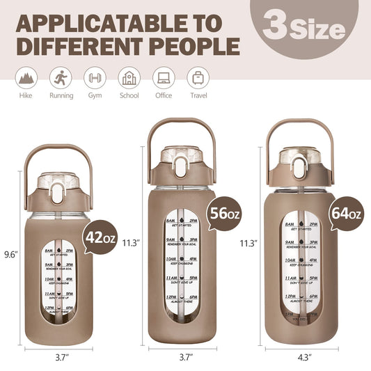 kytffu 64oz Glass Water Bottles with Straw, Half Gallon Motivational Glass Bottle with Silicone Sleeve and Time Marker, 2L Leakproof Large Glass Water Jug for Gym Home Office,Amber