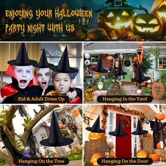 Legigo 12 PCS Halloween Decorations Witch Hat- Hanging Witch Hats Decorations with Rope and 60 Pcs 3D Bat Stickers, Black Witches Hat Costume Accessory for Halloween Party Decor Indoor Outdoor Porch
