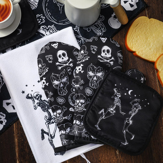 Leinuosen 6 Pcs Halloween Skull Kitchen Towels Oven Mitts and Pot Holders Set Skeleton Hand Dish Towels Skull Oven Mitt Set for Kitchen Home Decorations Cooking Baking Gifts (Classic Color,Skeleton)