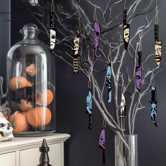 12pcs Horror Movie Decor Knife Hanging Halloween Tree Decorations - Wooden Halloween Ornaments Knife Shaped Pendants for Halloween Decorations Indoor Tree Window Wall Decor