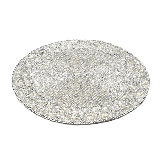 13" Round Beaded Placemat - Handcrafted Glass Beads in White Silver - Luxury Dining Table Decor, Wedding & Housewarming Gift, Holiday Use Pack of 1 by ALPHA Living HOME