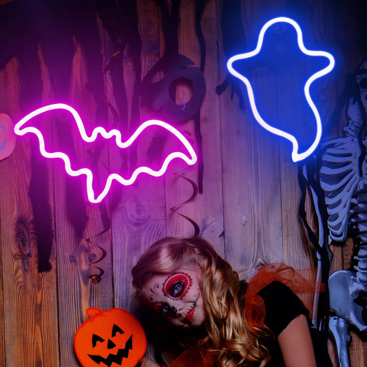 2 Pack Halloween Decoration LEDs Neon Sign Light Ghost Neon Sign Bat Lights Neon Signs Hanging Neon Signs for Halloween Party Decorations Indoor Home Window Decorations(Batteries Not Included)