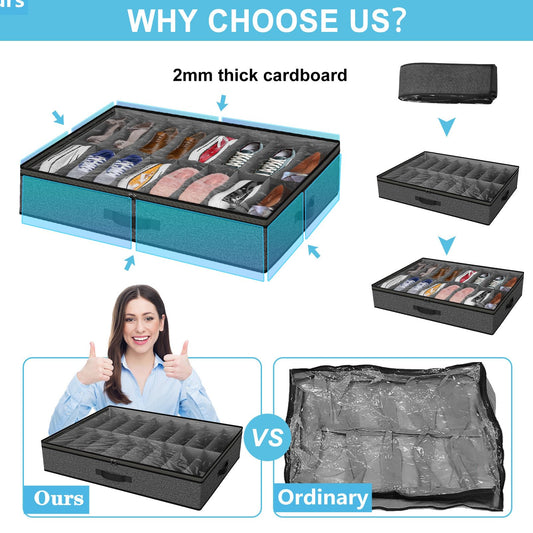 2 Pack Under Bed Shoe Storage Organizer for Closet, Fits Total 32 Pairs Foldable Underbed Shoes Containers Boxes Under the Bed Storage Bedding with Sturdy Handles&Clear Window for College Dorms, Grey