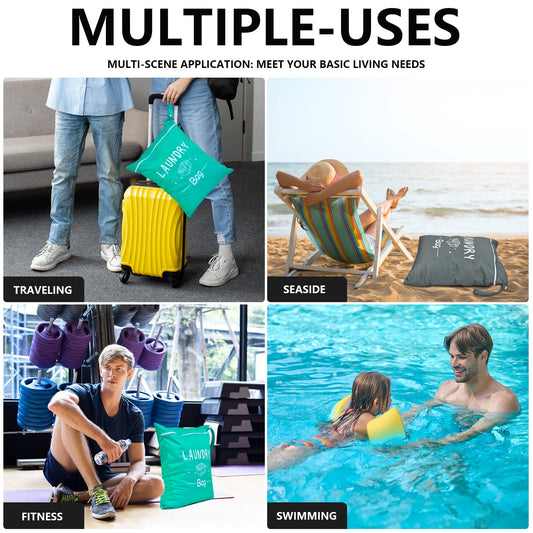 2 Pcs Large Travel Laundry Bags - Waterproof Wet/Dry, Washable, Drawstring, Bathing Suit, Workout, Gym Clothes, Swimming, Yoga - Green, Grey