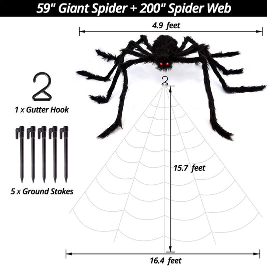200" Halloween Spider Web + 59" Giant Spider Decorations Fake Spiders with Triangular Huge Spiders Web for Indoor Outdoor Halloween Decorations Yard Home Costumes Parties Haunted House Décor