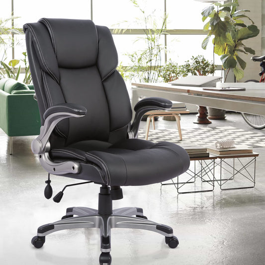 COLAMY High Back Executive Office Chair- Ergonomic Home Computer Desk Leather Chair with Padded Flip-up Arms, Adjustable Tilt Lock, Swivel Rolling Chair for Adult Working Study-Black