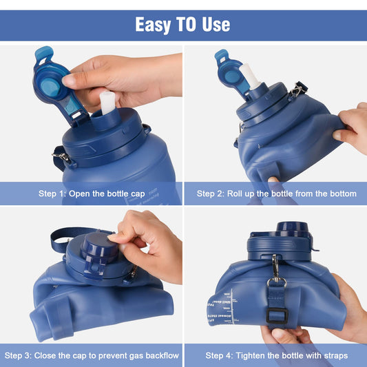 Collapsible Water Bottles, 2L/64OZ travel water bottle Bottle with Straw, Half Gallon Large Water Bottle for Travel Outdoor Sports Runing Fitness Yoga (Upgraded blue)