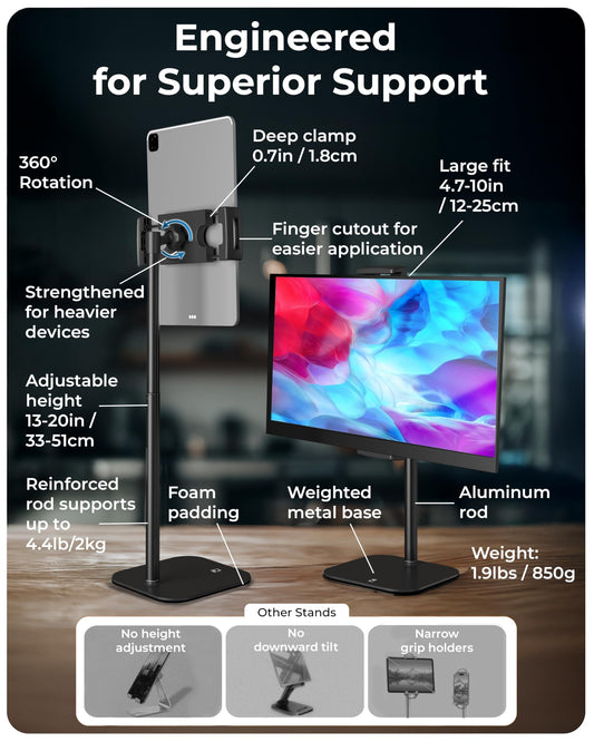 COOPER TabStand Height Adjustable iPad Stand for Desk, Heavy-Duty 7-17" Tablet Holder & Portable Monitor Stand | 4.4lb Holding Strength | iPad Holder for Pro, Air, Mini, Kindle (Night Black)