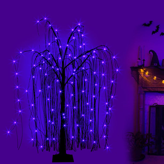 EAMBRITE Halloween Tree 4 FT 180 LED Black Willow Tree with Orange Purple Fairy Lights and Spider Web, Lighted Spooky Artificial Tree for Indoor Outdoor House Home Halloween Decorations