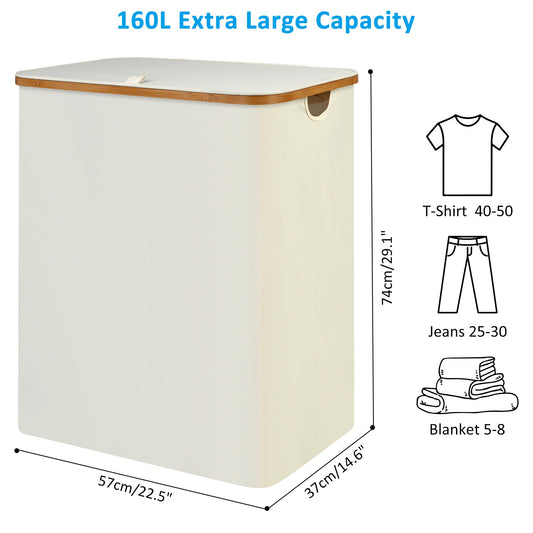 efluky Laundry Hamper with Lid, 160L Tall Laundry Basket with Bamboo Handles for Clothes and Toys, Collapsible Laundry Hamper with 2 Inner Bags for Bedroom and Bathroom, Beige