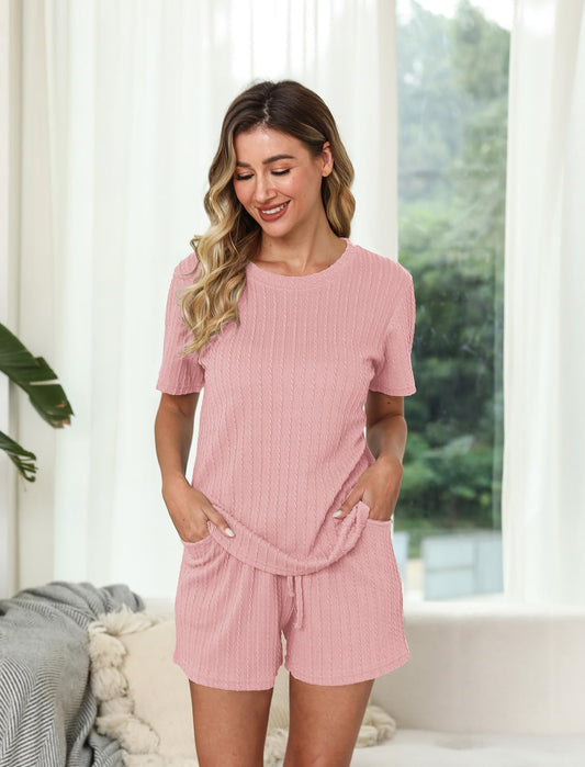 EISHOPEER Knit Matching Pajamas Sets Couple Drawstring Nightwear Short Sleeve Sleepwear 2 Pieces Loungewear with Shorts Pink Large