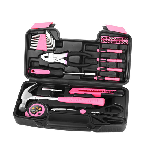 39 Piece All Purpose Basic Household Pink Tool Kit for Women - Small Tool Set with Toolbox Great for Home, Garage, Office and College Dormitory Use