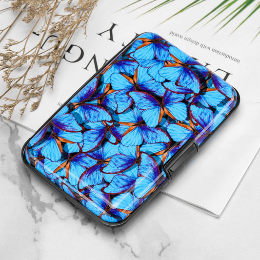 ELFISH RFID Blocking Credit Card Protector Aluminum ID Case Hard Shell Business Card Holders Metal Wallet for Men or Women (Blue Butterfly)