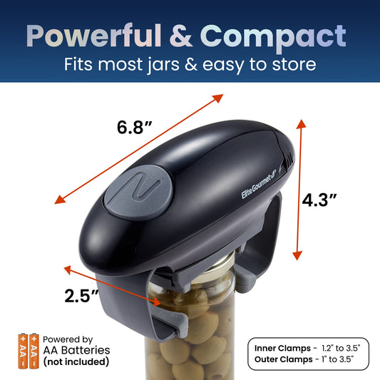 Elite Gourmet EJO800 High Power Torque Automatic Battery Operated Electric Jar Opener, One-Touch Electric Operation, Easily Remove Most-Size Lids with Auto-Size Guides, Black/Gray