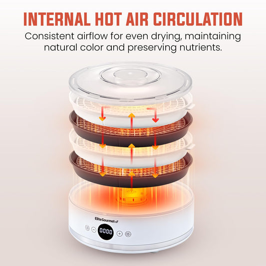 Elite Gourmet EFD329WD Digital Food Dehydrator with 5 BPA Free SlimStore™ Collapsible Trays for Compact Storage, Adjustable Timer and Temperature Controls, Jerky, Herbs, Fruit, Veggies, Snacks, White