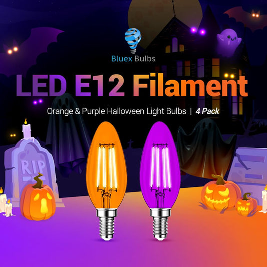 4 Pack Filament E12 Candelabra LED Halloween Light Bulbs - 4W 40 Watt Equivalent E12 Candelabra Base - Vintage LED Decor Purple Orange Light Bulbs Party Decoration, Porch, Halloween Lights