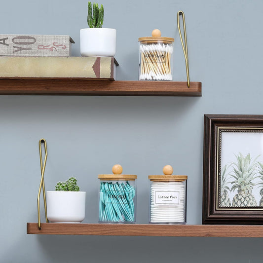 4 Pack Qtip Holder Dispenser with Bamboo Lids - 10 oz Clear Plastic Apothecary Jar Containers for Vanity Makeup Organizer Storage - Bathroom Accessories Set for Cotton Swab, Ball, Pads, Floss