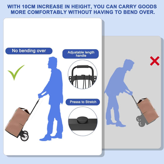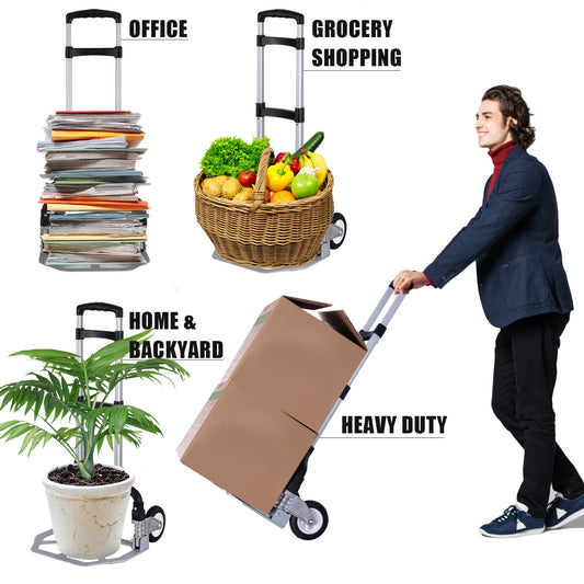 Folding Hand Truck 110lbs, 2+2 Wheel System - 2 Rotating & 2 Stabilizer Wheels Dolly Cart with Elastic Rope & Storage Bag, Adjustable 3-Level Handle for Shopping, Travel, Office, Home Use