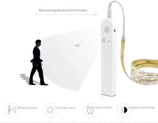 FOLGEMIR 1 m LED Strip with Motion Sensor, Battery Operated Night Light with PIR Sensor, Waterproof Cabinet Lighting, Self-Adhesive Fairy Lights (3000 K Warm White, 1 m)