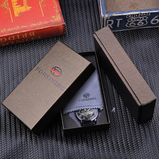 FORSINING Black Mechanical Watch for Men Minimalist Retro Design Staempunk Mechanical Skeleton Wrist Watch Transparent Business Mesh Band Watch