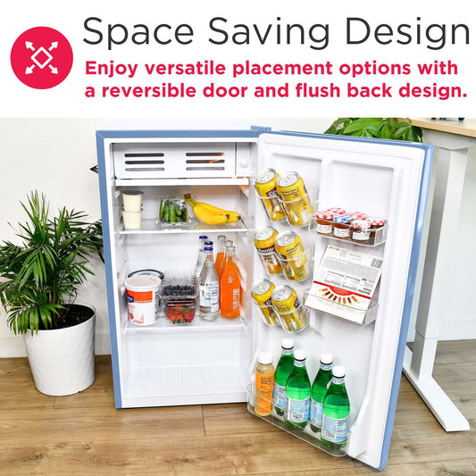 Frigidaire Retro Compact Fridge with Chiller, 3.2 cu ft Countertop Fridge with Built-In Bottle Opener, Compact Refrigerator for Office, Bedroom, Dorm Room or Cabin - 16.5" D x 19" W x 31" H (Blue)