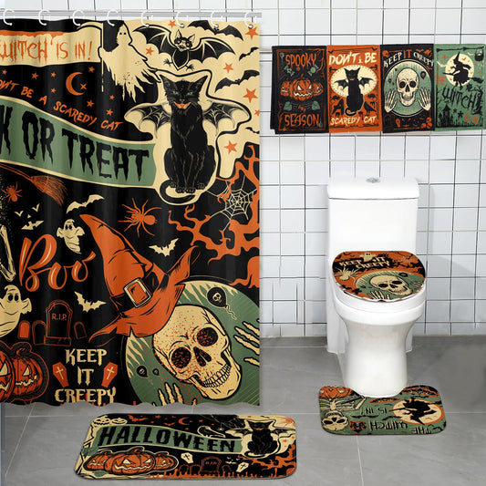 FuWeave 8 Pcs Halloween Shower Curtain Set for Bathroom Include Vintage Ghost Pumpkin Bat Cat Towels Non Slip Skull Rugs Toilet Lid Cover Spider Web Bath Mat and 12 Hooks for Halloween Bathroom Decor