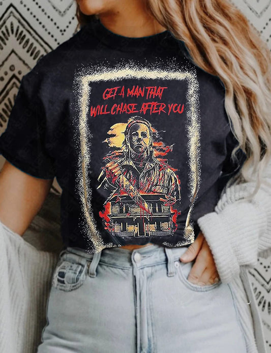 Get A Man That Will Chase After You Halloween Bleached Shirt Women Horror Scary Movies Michael Myers Jason Graphic Tees (Black, X-Large)