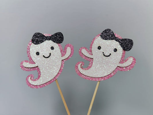 Ghost Cupcake Toppers Pink Glitter, Halloween Ghost Birthday Baby Shower Cupcake Toppers Ghost Food Cupcake Picks for Pink Halloween Baby Shower Birthday Party Cake Supplies - 24Pcs