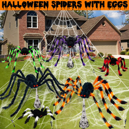 6 PCS Halloween Spider Decorations Set with 23" Hanging Spider Egg Sacs 6 Packs, 50" Giant Scary Halloween Props,Realistic Hairy Colorful Spider Set for Window Yard Party Haunted House Indoor Outdoor