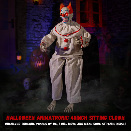 Halloween Animatronic Sitting Clown, Halloween Animated Decorations with Sound Activated, Creepy Sound, Light Up Eyes, Scary Move, Haunted House Holiday Spooky Decor Horror Prop, for Indoor Outdoor
