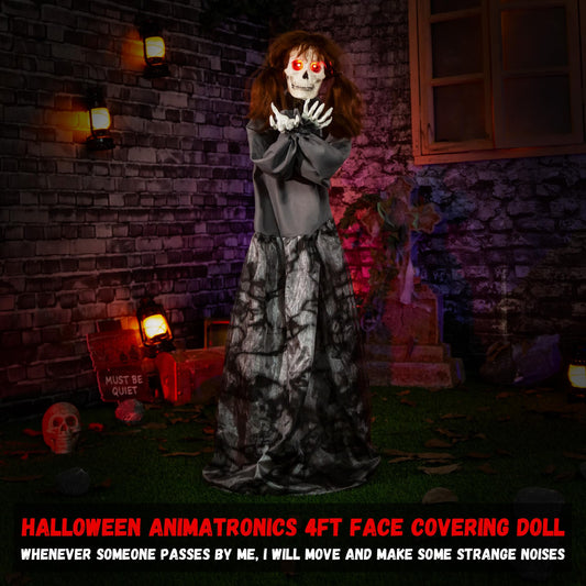 Halloween Animatronics 4ft Spooky Doll Animated 48inch Decorations with Sound Activated, Creepy Sound, Light Up Eyes, Jumpscare, Haunted House Holiday Decor Horror Prop for Indoor, Outdoor, Yard Lawn
