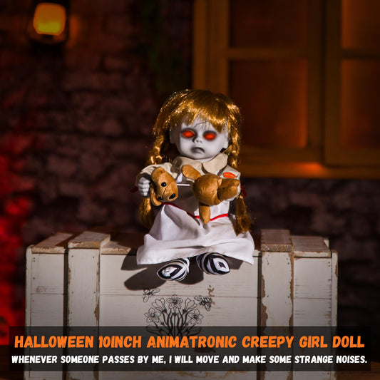 Halloween Animatronic 10inch Creepy Girl Doll, Halloween Animated Decorations with Sound Activated Spooky Sound, Light Up Eyes, Scary Move, Haunted House Holiday Decor Horror Prop for Indoor, Outdoor