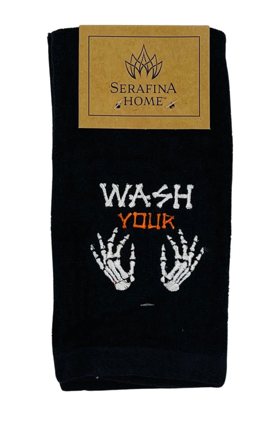 Halloween Fingertip Bathroom Towels Set of 2 – 12" x 18" Black 100% Cotton with Funny “Wash Your Hands or Bones” Design – Spooky & Humorous Bathroom and Kitchen Decor