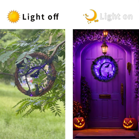 Halloween Wreaths for Front Door, 15 Inch Halloween Lighted Wreath with Bat and Cat Decor, 45 LED Purple Lights Battery Operated, Front Door Porch Wreath Decorations for Holiday Party (Purple)
