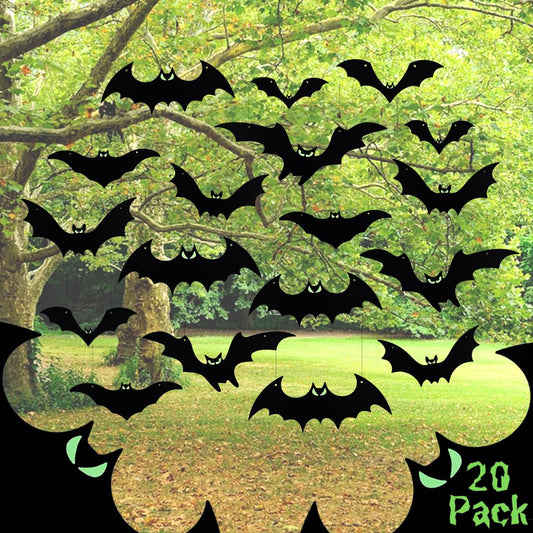 Hanging Bats Halloween Decorations Outdoor - 16 Pack Glowing Eyes Large Flying Bats 5 Different Size, Waterproof Plastic Realistic Black Bats Hanging in Tree Outside Halloween Decoration for Porch