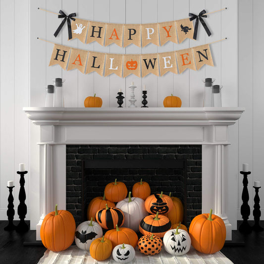 Highly Recommended Happy Halloween Burlap Banner - Multicolored Design Pumpkin Witch Halloween Party Decorations White Black Orange