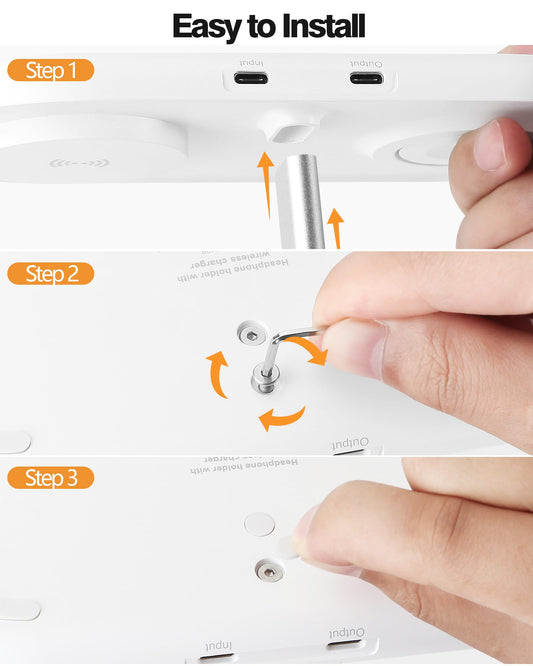HiWe 3-in-1 Headphone Stand - Universal Desktop Gaming Headset Holder with Wireless Charger for Phones/AirPods/iWatch, Aluminum Alloy Rod, Leather Pad, ABS Solid Base, White