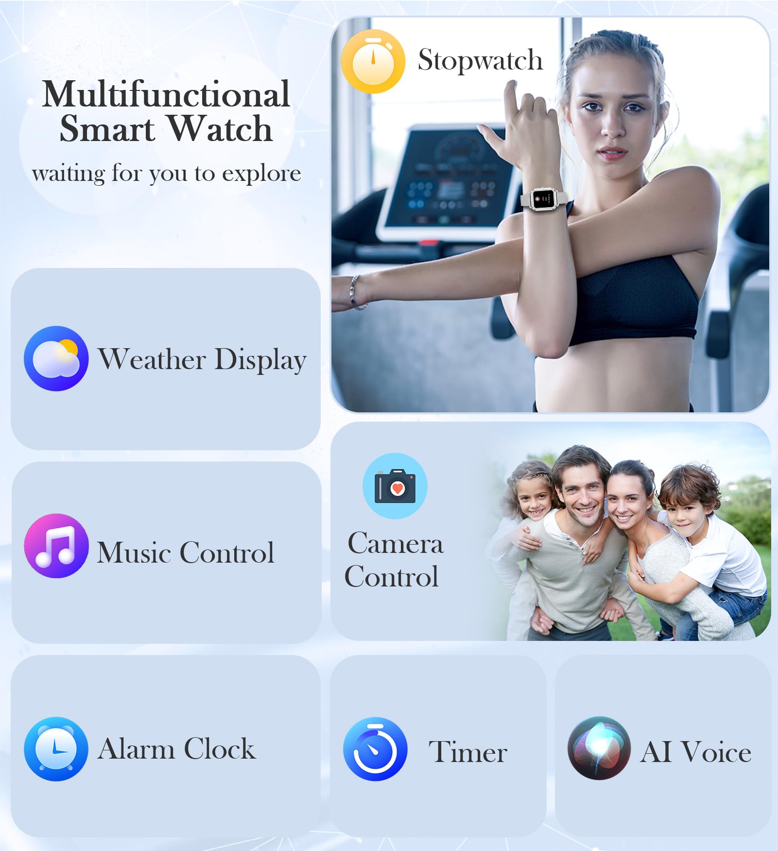 • 【Smart Notifications】Smartwatches support Bluetooth calls and message reminders. Android or iPhone phones only need to connect to Bluetooth to answer/make calls and view text and SNS messages (WhatsApp, Instagram, Twitter, Facebook, etc) directly on the smartwatch for women. The Bluetooth watch also supports AI voice control. When you are exercising or driving, you will not miss any calls and messages while freeing your hands.