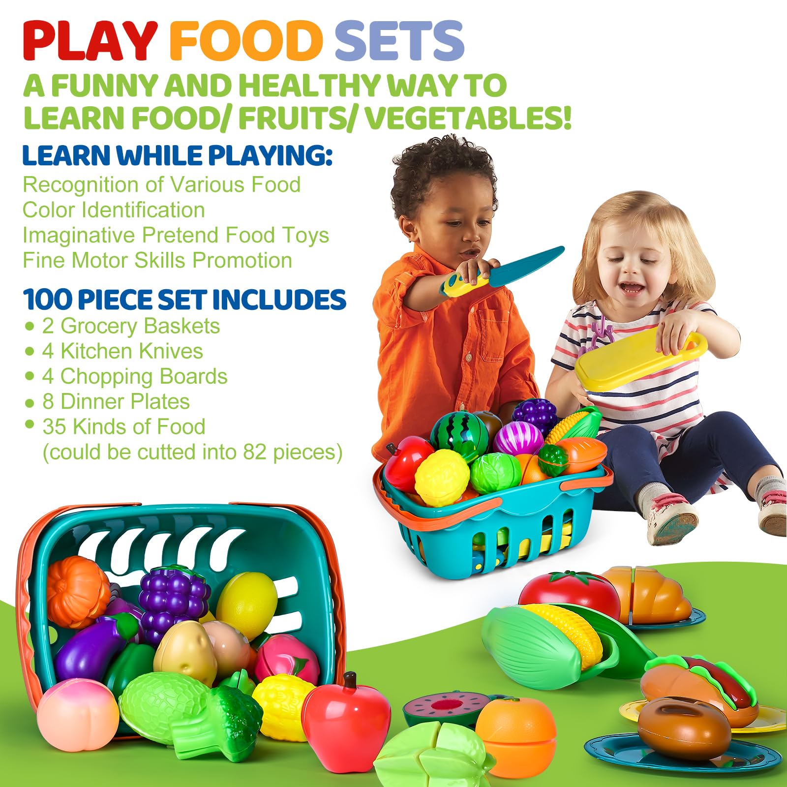 • Valuable Pretend Play Food Set for Toddlers: Package including 42 item 100pcs cooking toy. There are 35 different kinds of pretend fruit vegetables and play food, which could be separated into 82 small pieces, and 2 storage baskets, 4 cutting boards, 4 kitchen knives, and 8 dinner plates. A super value pack of play kitchen toys set for toddlers 1-3, provide endless hours of educational fun for your little one.