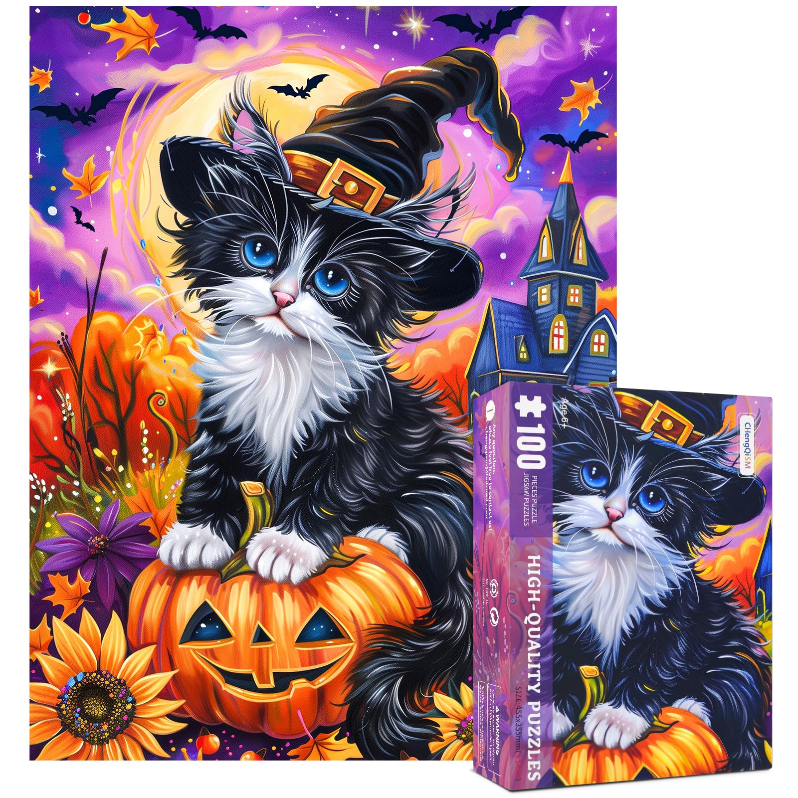 100 Piece Puzzles for Kids, Halloween Cat 100 Piece Puzzles for Adults, Cute Kitten Halloween 100 Pieces Puzzle for Kids Ages 4-8, Jigsaw Puzzle for Seniors Teens Brain Teaser