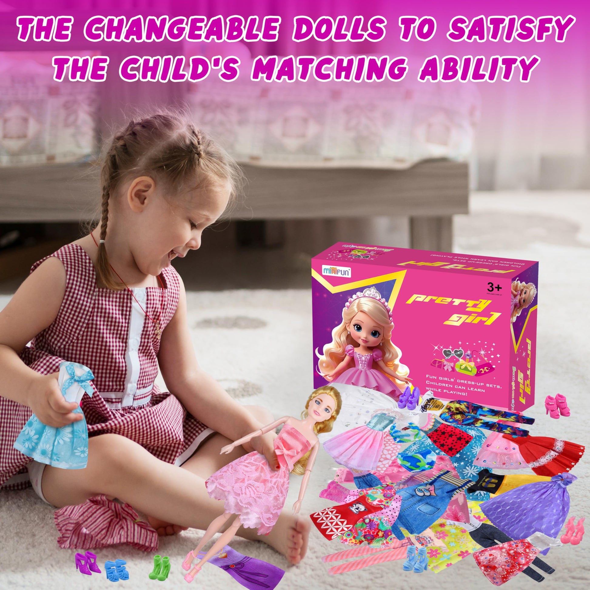 135 Pcs Doll Clothes and Accessories with Doll, Princess Gowns, Fashion Dresses, Slip Dresses, Top, Pants, Jumpsuit, Swimsuits, Shoes, Hangers, Doll Dress up Toys for Girls Kids Toddlers Toy Gifts